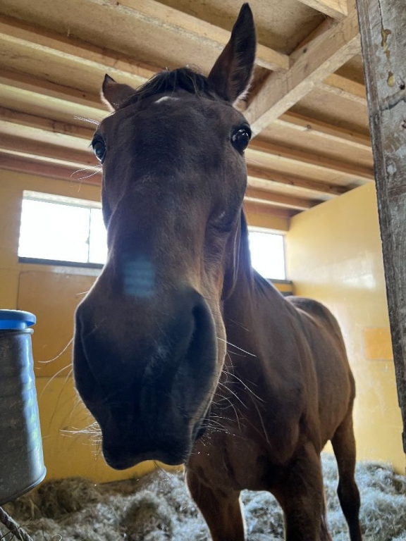 馬房で休息している様子も、見てきました。フォーチュンは扉から飛び出る事なく、写真撮影に協力的です。カメラを向けると、可愛い表情をしてくれます。