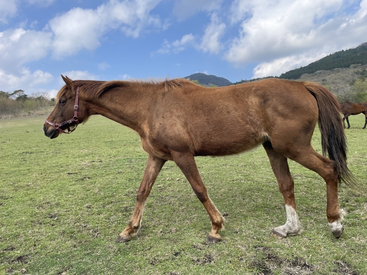 4月に入り、ポカポカと暖かく放牧地も青々としてきました。チトセ(ハーモニィチトセチャン)は青草を口いっぱいにして元気にのんびりと過ごしてくれています。