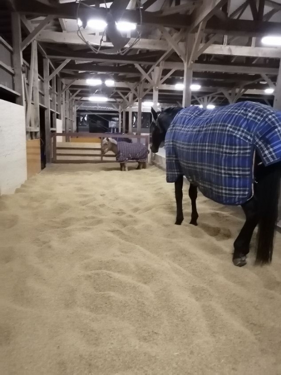 日常生活では、放牧場に行く時、ポニーのテンは砂利の道になると自分で端に避け、草の上に移動し左側を歩いて行きます。すると、おにくんはテンが前を歩いている時は自らテンを見習い、テンがスッと草の方に移動すると、後ろを歩くおにくんもスッと草の方に移動して歩きます。テンが戻るとおにくんも真似をして戻ります(笑)おにくんも色々考えながら歩いているんだなーと思う出来事です。