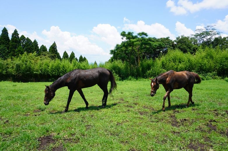 蒸し暑い毎日ですが体調も崩さず食用旺盛で元気にしています。相変わらず同じ牝馬と仲が良く、姿が見えなくなると慌てて鳴きながら探すほどべた惚れの様子です。