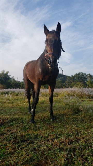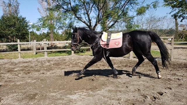 最近はキャバレッティを跳ぶ練習を始め、低い横木なら駆足でもしっかりと跳べるようになりました。人が乗らずに跳ばせると焦ってしまうようで、失敗すると爆走することがありますが、人が乗って跳ぶ時はとても冷静で安定しています。