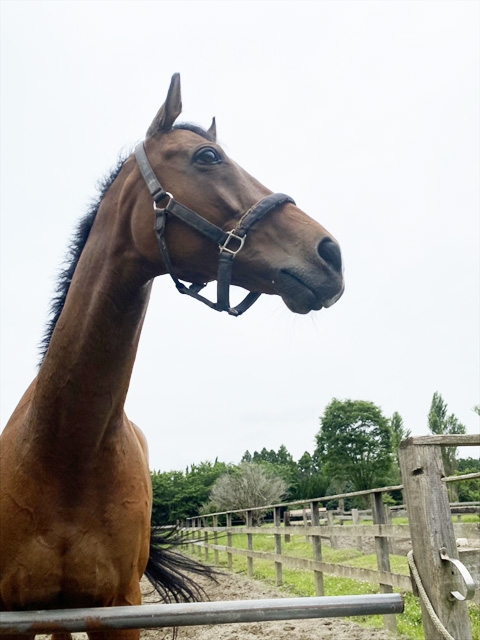 暑さに弱いせいか、他の馬に比べると人(馬)一倍汗かきです。皮膚が弱いので、気をつけてお手入れをしてくださっています。