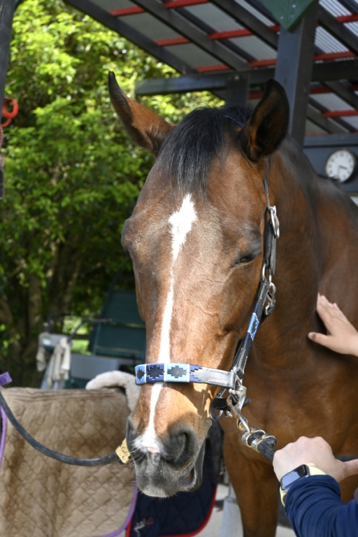 ルックトゥワイスもこの日、健康診断を受けました。診断は、1頭ずつつなぎ場に出して行いました。コアレスピューマ、クレスコグランドと続けて診てもらっているときに、視線を感じて振り返ると、ルックと目が合いました。