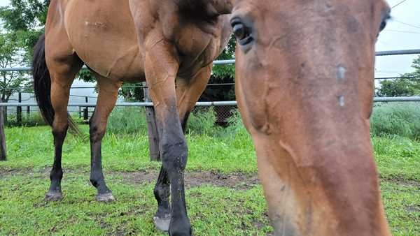会員様が来られた時にも、残念ではありますがナイスゴールドには糖質の多い人参をあげられません。先日来られた会員様は、近づいてきたナイスゴールドが擦り寄って来て、それがとても可愛いとおっしゃって、けっこう長い間、ナイスゴールドに抱きつくくらい触れ合っておられました。その間、私は他の会員様を別の放牧地にご案内していたのですが、遠くに見える会員様はずっとナイスゴールドのところにおられたので不思議でしたが、近くに行ってみたら、擦り擦りしていて、とても微笑ましかったです。