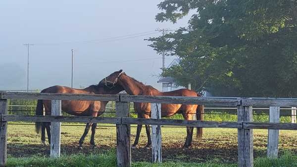 涼しい早朝に、できるだけ早く放牧するようにしています。日中は晴れるとアブが多くなり、馬たちにはつらい季節になりました。蒸し暑い日も多かったですが、割と涼しい日もありました。ここ数日は涼しいです。また、日中は暑くても朝夕は涼しいです。お天気が続かず、牧草作業はまだたくさん残っています。