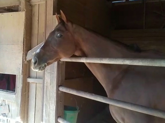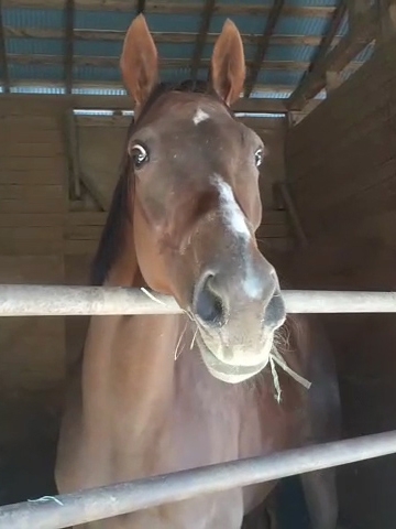 栗毛に四白、小柄ですらりとした体型。フォスターホースのキョウエイボーガンや響輝が使っていた馬房に入り、元気いっぱいに過ごしています。